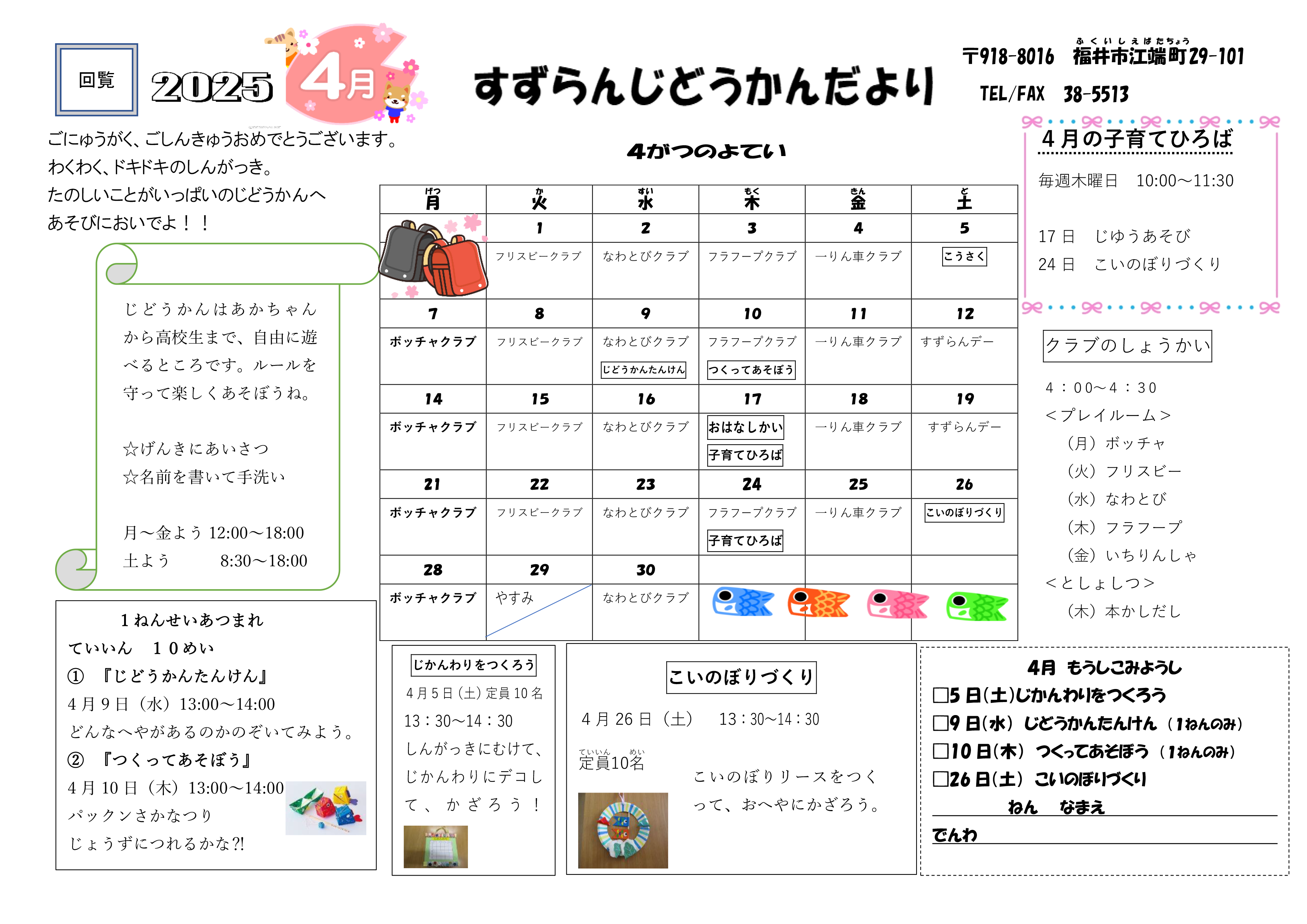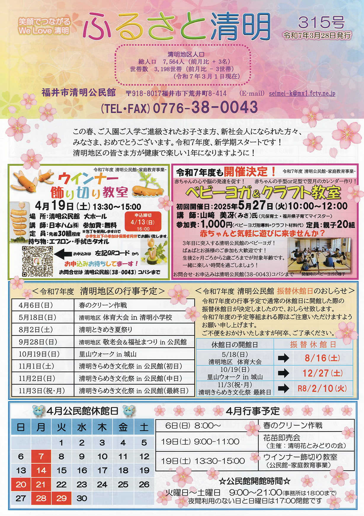 2025年03月30日 大島町回覧情報 回覧板 2025.03.302025.04.11 2025年03月30日 回覧情報 広報ふくい(表紙)・ふるさと清明・すずらんじどうかんだより・救急法講習 2025年04月11日 回覧情報更新 広報ふくい(全ページ公開) 4/19大島町内公民館イベント情報 ※使い方:「タイトル文字」または「表紙画像」をタップすると全ページを確認でき、拡大表示もできます。 広報ふくい No1656 2025.04.10 ふるさと清明 315号 2025.03.28 すずらん児童館だより4月号 2025.03 清明公民館 救急法講習 2025.05.10 13:30~14:30 大島町内公民館 クラフト教室 2025.04.19 13:30~15:30 詳細確認および問合せ申込はこちらをタップしてください