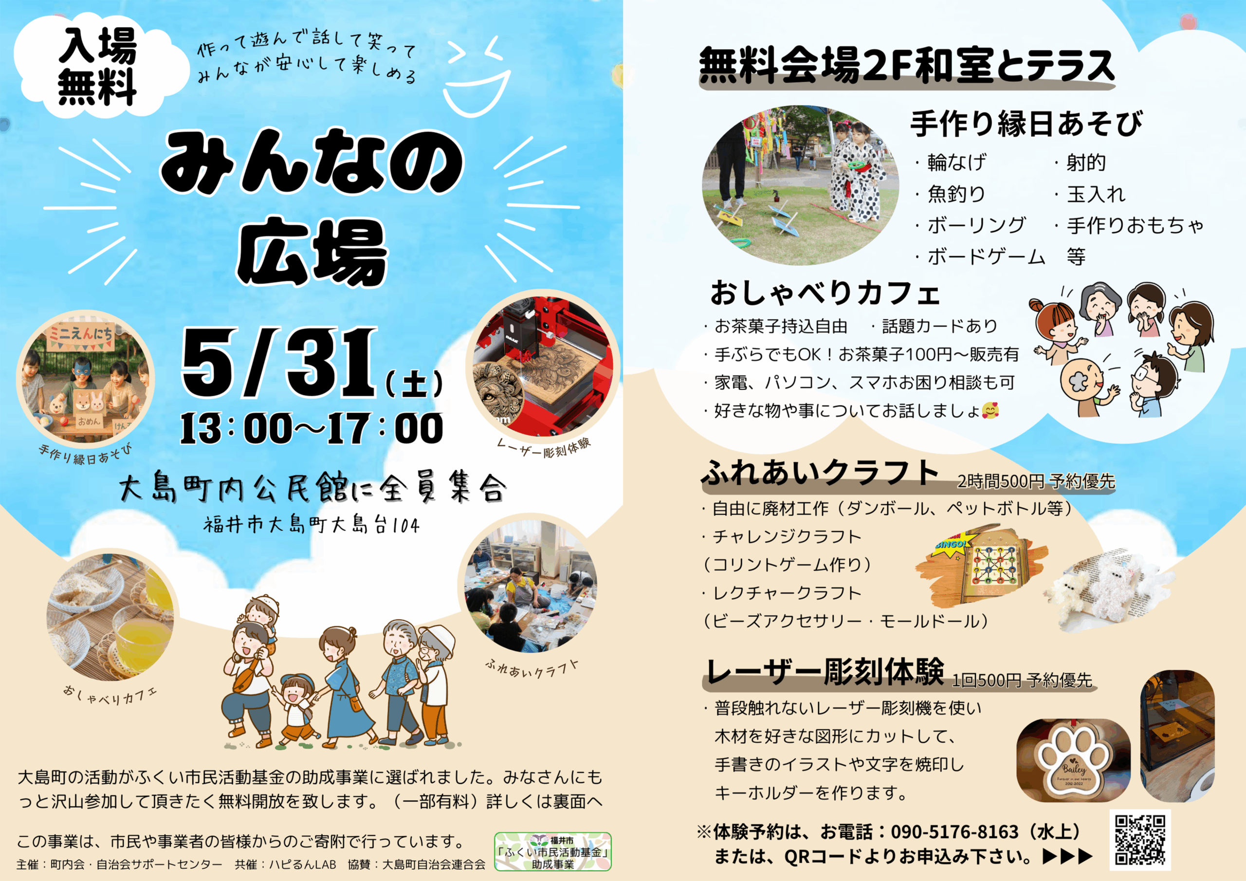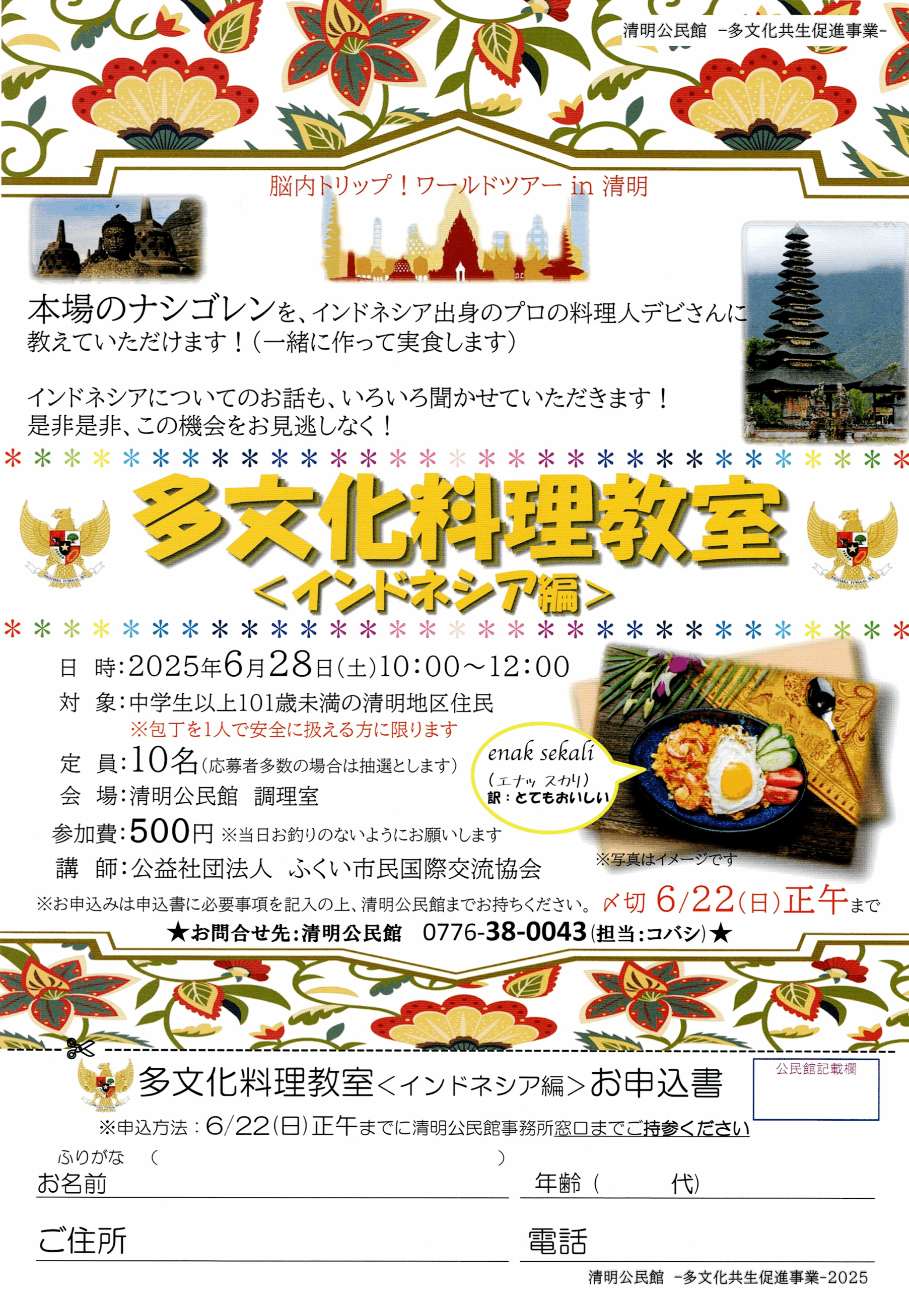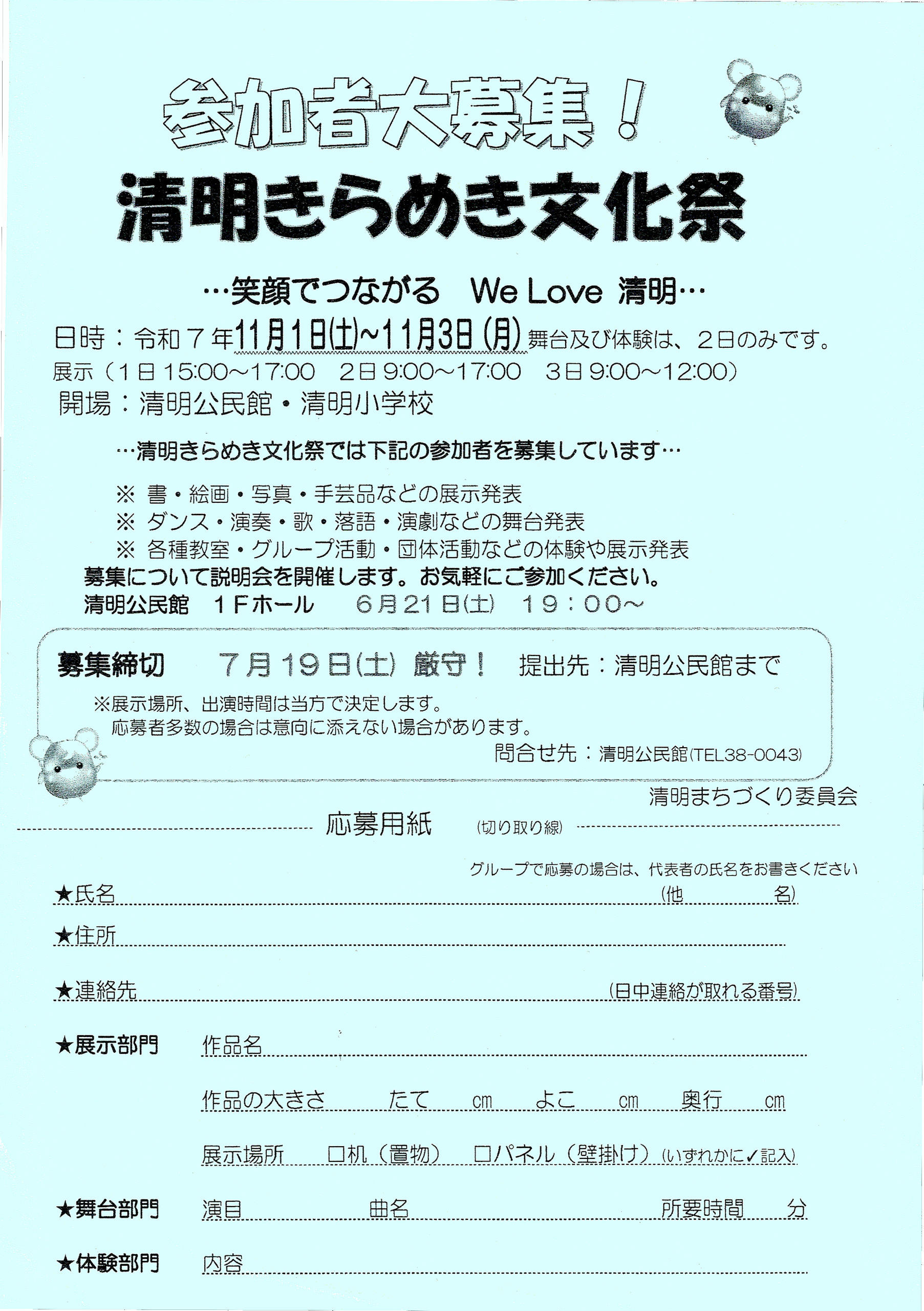 2025年06月01日 大島町回覧情報 回覧板 2025.06.01 2025年06月01日 回覧情報 清明の防災、資源回収のお知らせ、清明きらめき文化祭参加者募集、市民憲章運動市民協力金の支援依頼、、清明公民館イベント「多文化料理教室」、大島町内公民館イベント「アイシングクッキーを作ろう」 ※使い方:「タイトル文字」または「画像」をタップすると全ページを確認でき、拡大表示もできます。 清明の防災 第9号 2025.06 資源回収のお知らせ 2025.06.29 清明きらめき文化祭参加者募集 2025.06.21 市民憲章運動市民協力金の支援依頼 清明公民館イベント 多文化料理教室 2025.06.28 大島町内公民館イベント アイシングクッキーを作ろう 2025.06.15 申込はコチラ▶https://forms.gle/DzSByBoc62Us1zKy9
