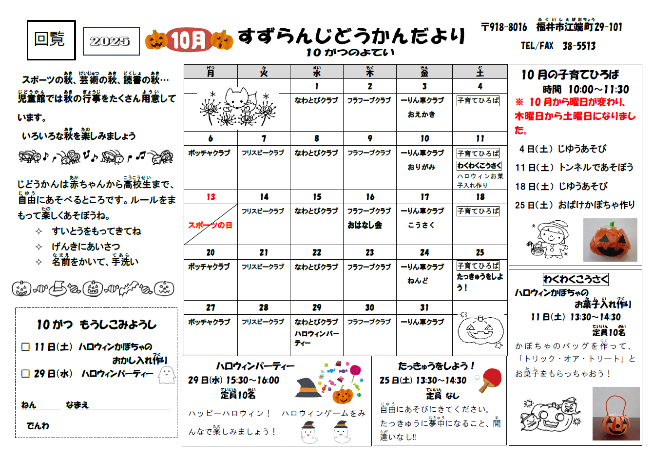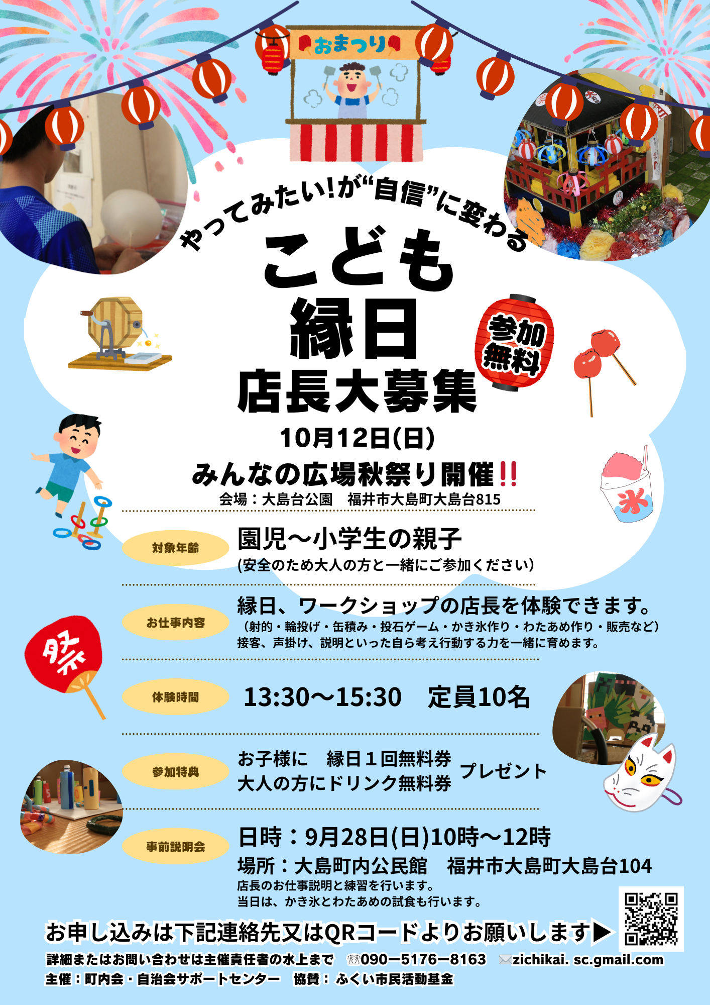 10月12日みんなの広場秋祭り「こども縁日店長大募集」9月28日説明会 ![]() 申込みお問合せは、下記をタップしてください |