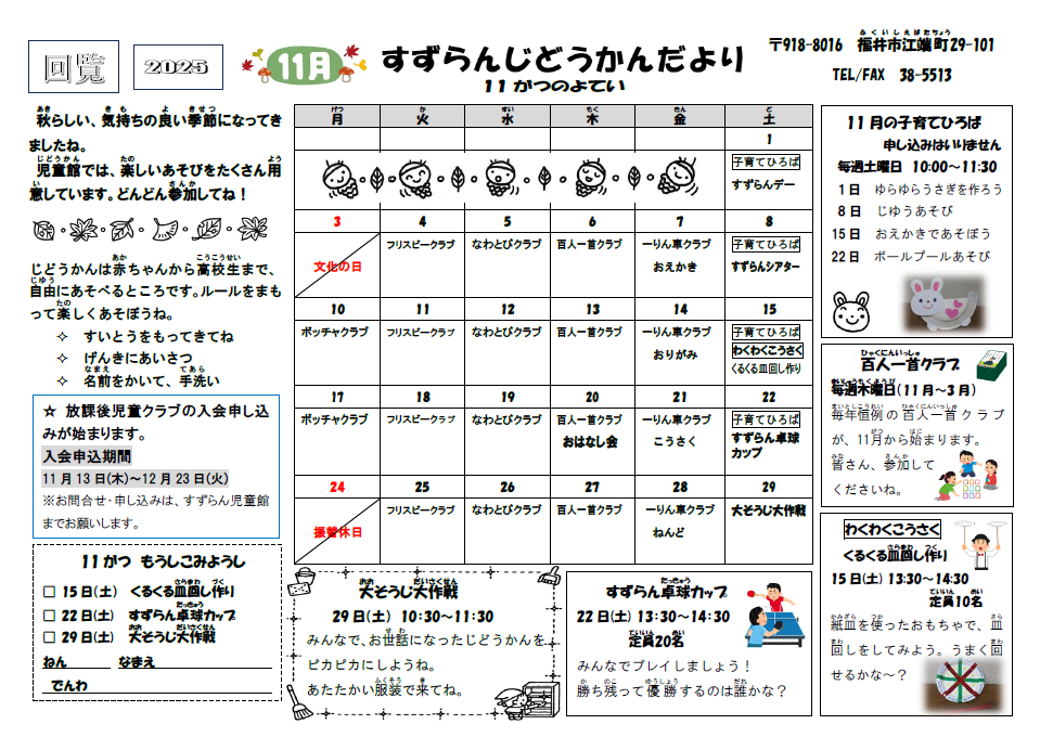 2025年10月16日 大島町回覧情報 回覧板 2025.10.172025.10.24 2025年10月16日 回覧情報 広報ふくい・ふるさと清明・防火委員会だより・資源回収のお知らせ・水曜サロンのお知らせ・すずらんじどうかんだより・足羽中学校だより・清明きらめき文化祭・SDGs研修会・SDGs取組み報告 ※使い方:「タイトル文字」または「画像」をタップすると全ページを確認でき、拡大表示もできま。 広報ふくい No.1663 202511 ふるさと清明 第322号 20251016 福井市防火委員会だより 2025.11 No80 資源回収のお知らせ 2025.11.16 水曜サロンのお知らせ 10月 すずらんじどうかんだより 10月号 202510 足羽中学校だより ふれあい 第7号 20251003 清明きらめき文化祭 2025.11.01~03 SDGs研修会 2025.11.08 SDGs取組み報告