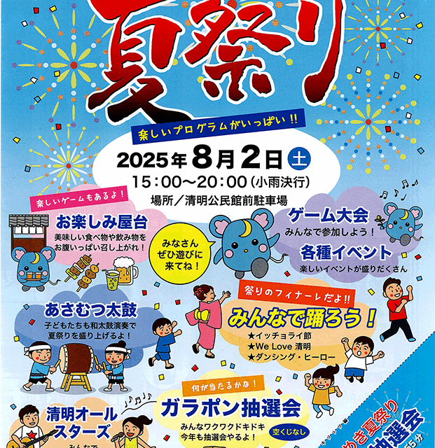 2025年07月06日 回覧情報 清明ときめき夏祭り・大島町内公民館イベント※使い方:「タイトル文字」または「画像」をタップすると全ページを確認でき、拡大表示もできます。清明ときめき夏祭り 2025.08.02大島町内公民館 みんなの広場 ...